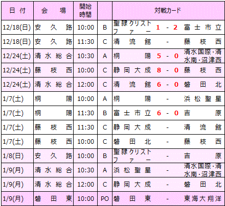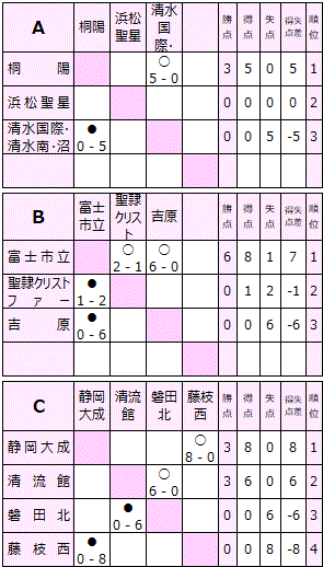 | 桐陽、吉原、東海大静岡翔洋、常葉大橘、静岡大成、藤枝順心、清流館、藤枝西、磐田東、磐田北、聖隷クリストファー、浜松聖星、富士市立、合同(沼津西、清水国際、清水南) |