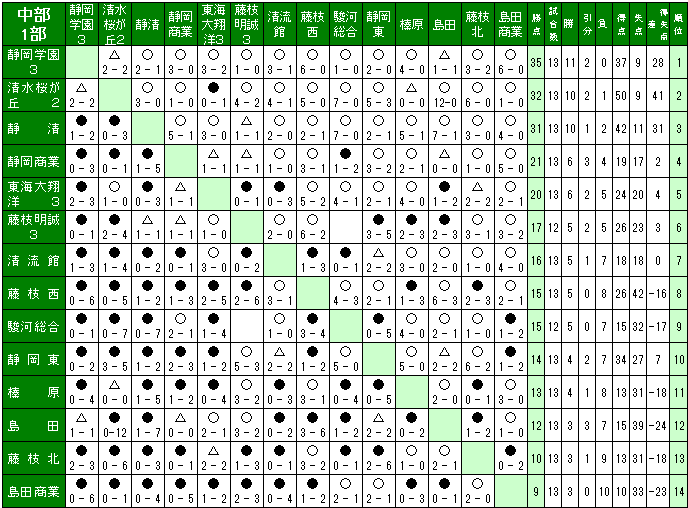 ◇静岡県高校サッカー中部地区リーグの結果を送信ください。 記入例 1部 富士山 3-3 琵琶湖 ◇