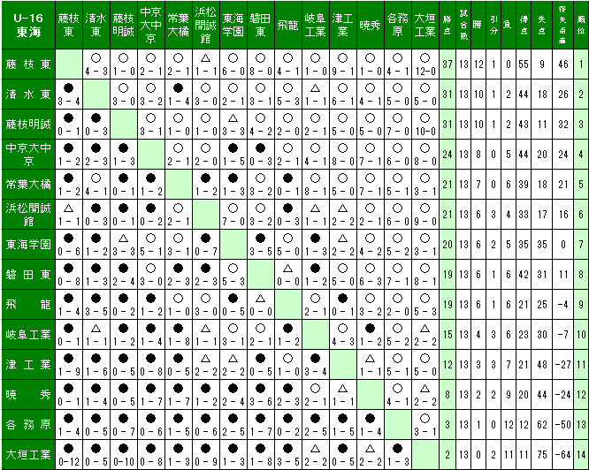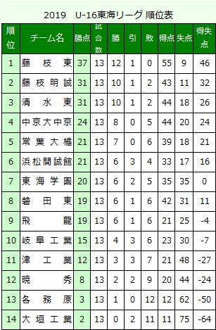 東海ルーキーリーグU-16 2019 日程表・試合結果