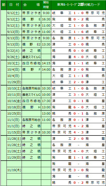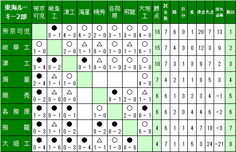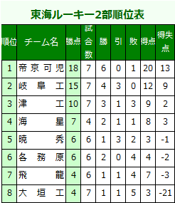 東海ルーキーリーグU-162 リーグ表