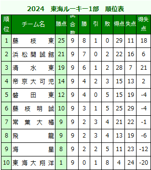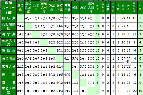 東海ルーキーリーグU-16 1部 リーグ表