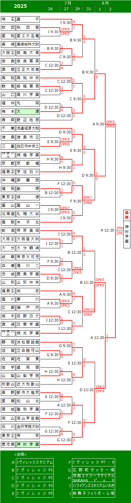 | 試合時間は70分(35分ハーフ)とし、ハーフタイムのインターバルは原則として15分間とする。勝敗が決しない場合は、PK戦により次回戦進出校を決定する。但し、決勝においては、20分(10分ハーフ)の延長戦を行い、なお勝敗が決しない場合は、PK戦により優勝校を決定する。 |